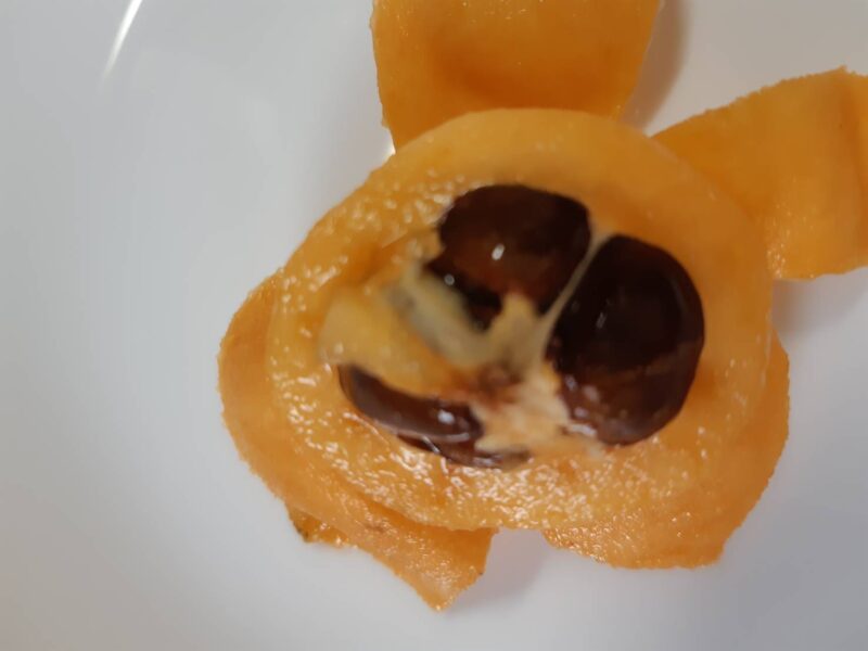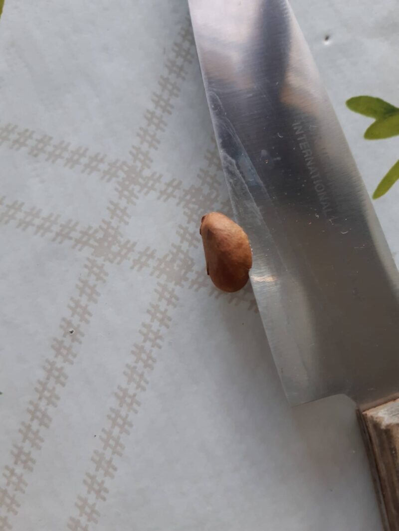 枇杷の種に少しキズを付ける、これにより、種の成分がエキスに抽出しやすくなります。