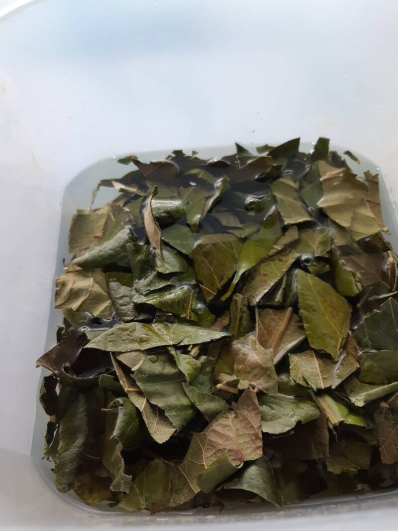 刻んだ枇杷葉を入れた容器にホワイトリカーを注ぐ、葉が隠れるくらい注ぐ。